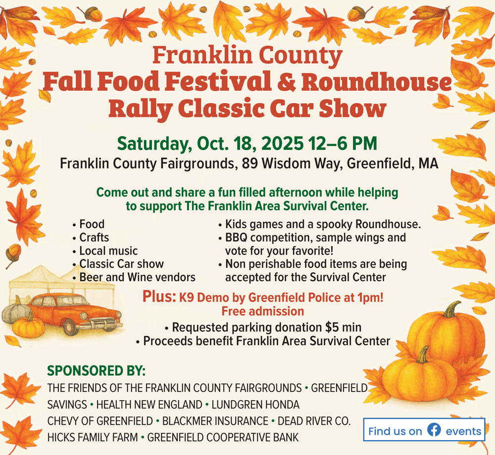 Oct 14, 2025. Franklin County Fall Food Festival & Roundhouse Rally Classic Car Show (October 18, 2025) Events Ads from The Greenfield Recorder
