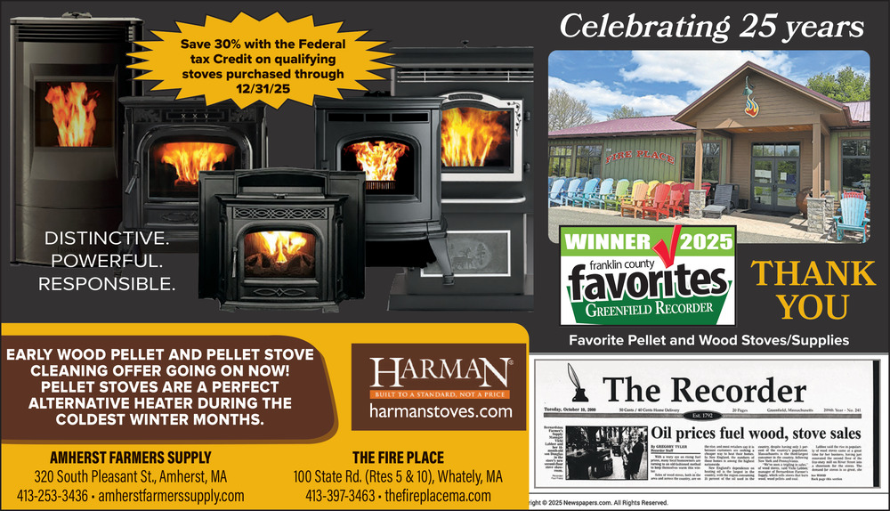 Oct 25, 2025. Amherst Farmers Supply / The Fire Place Hardware Ads from The Greenfield Recorder