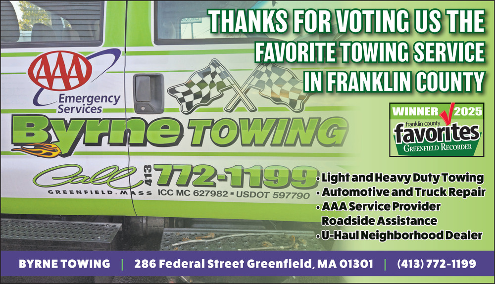 Oct 25, 2025. Byrne Towing Towing Ads from The Greenfield Recorder