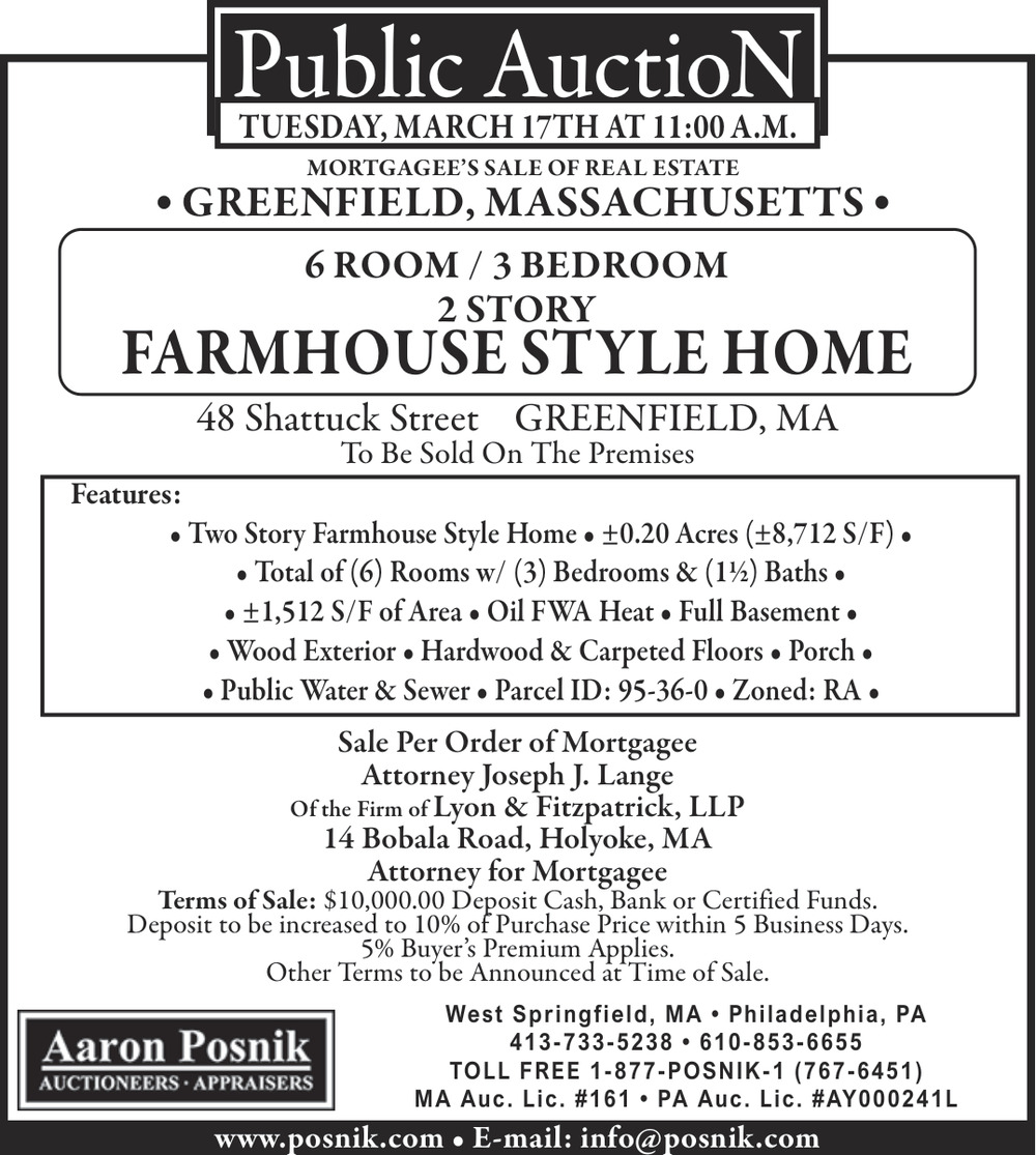 Feb 28, 2026. Aaron Posnik Auctioneers & Appraisers Auctions Ads from The Greenfield Recorder
