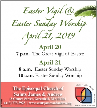 Apr 19, 2019. The Episcopal Church of Saint James and Andrew Church Ads from The Greenfield Recorder
